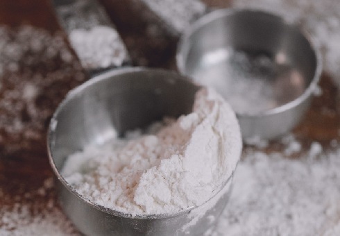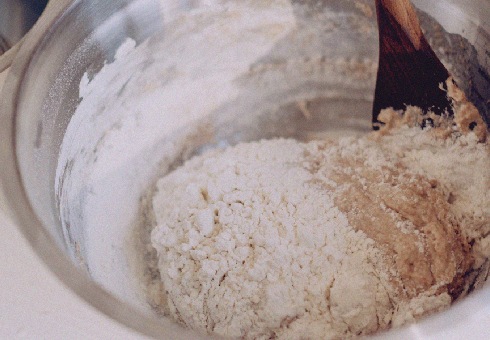 • In a large bowl, mix steamed flour and salt. Add boiling water slowly, mixing with a wooden spoon. When the mixture has cooled slightly, use hands to break down dough to create a grainy or pebbly texture. If too wet, add a little flour.
