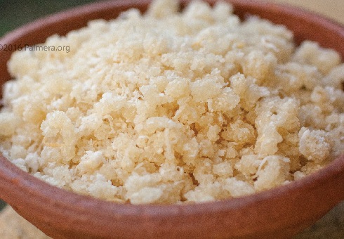 This recipe requires steamed cassava and coconut. When freshly steamed the fibers of the cassava expand with warm air and moisture, releasing puffs of steam when broken. The grated coconut adds a moist and milky balance to the taste and which makes the fibrous texture of the puttu a little less noticeable.