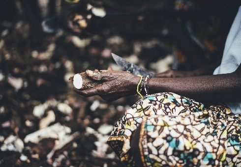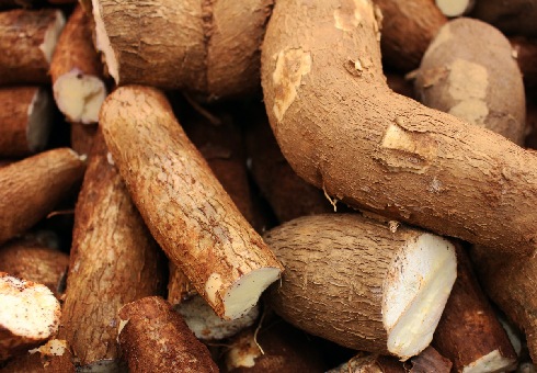 Place cassava pieces (fresh or frozen) on a tray and allow to dry thoroughly (indoors or out). When completely dry and slightly shrivelled, pound finely in a mortar or grind using a food processor.